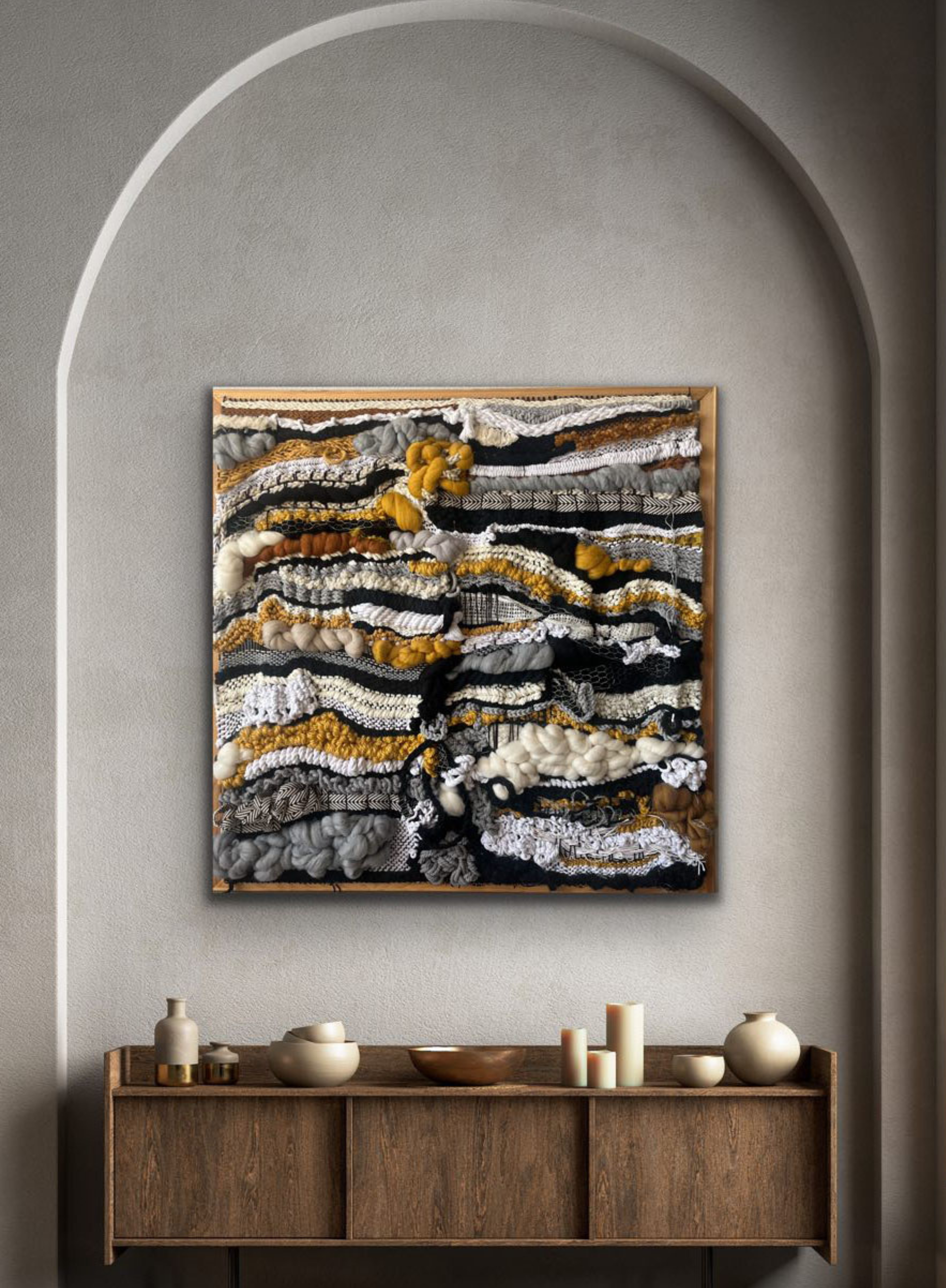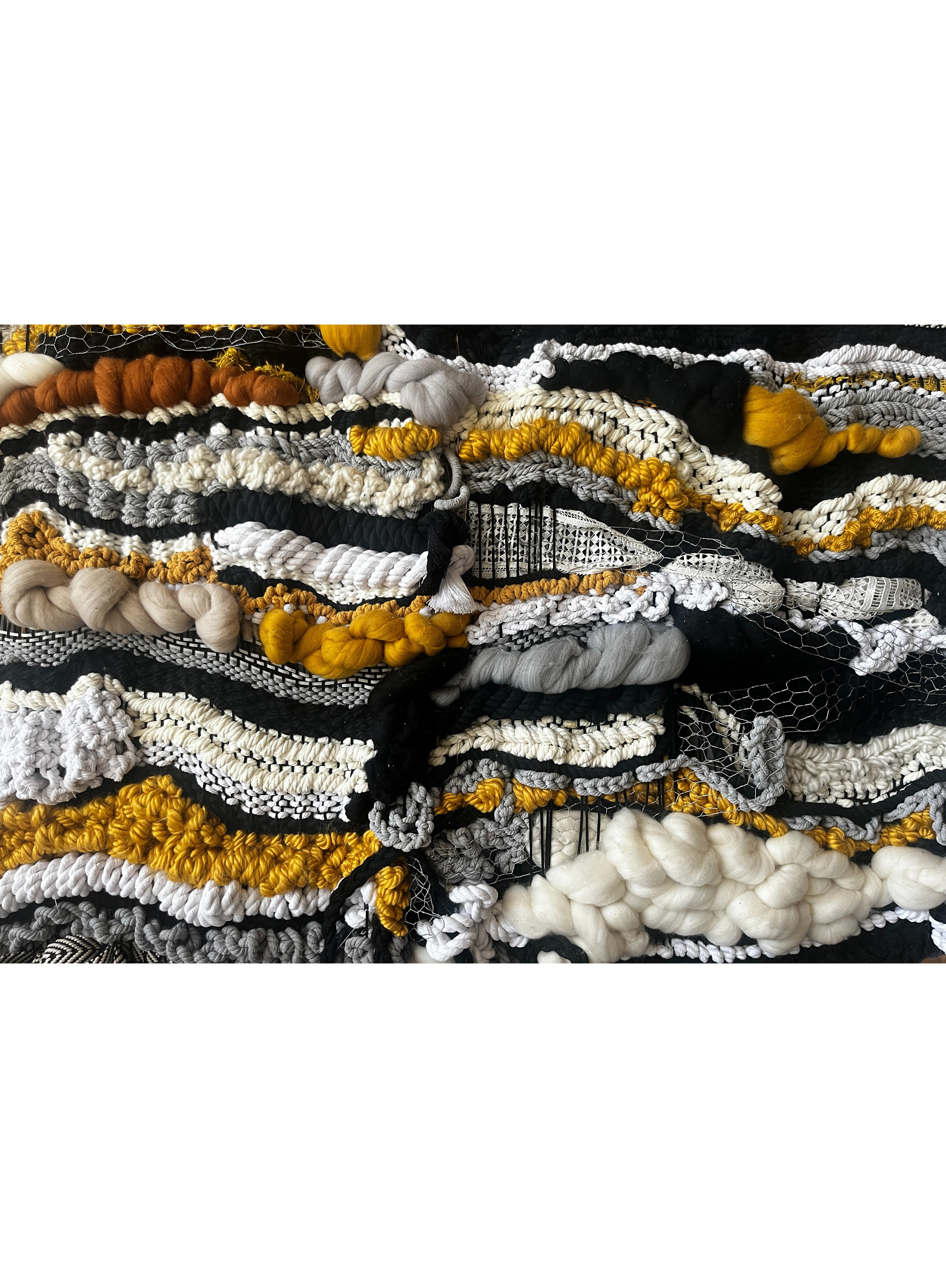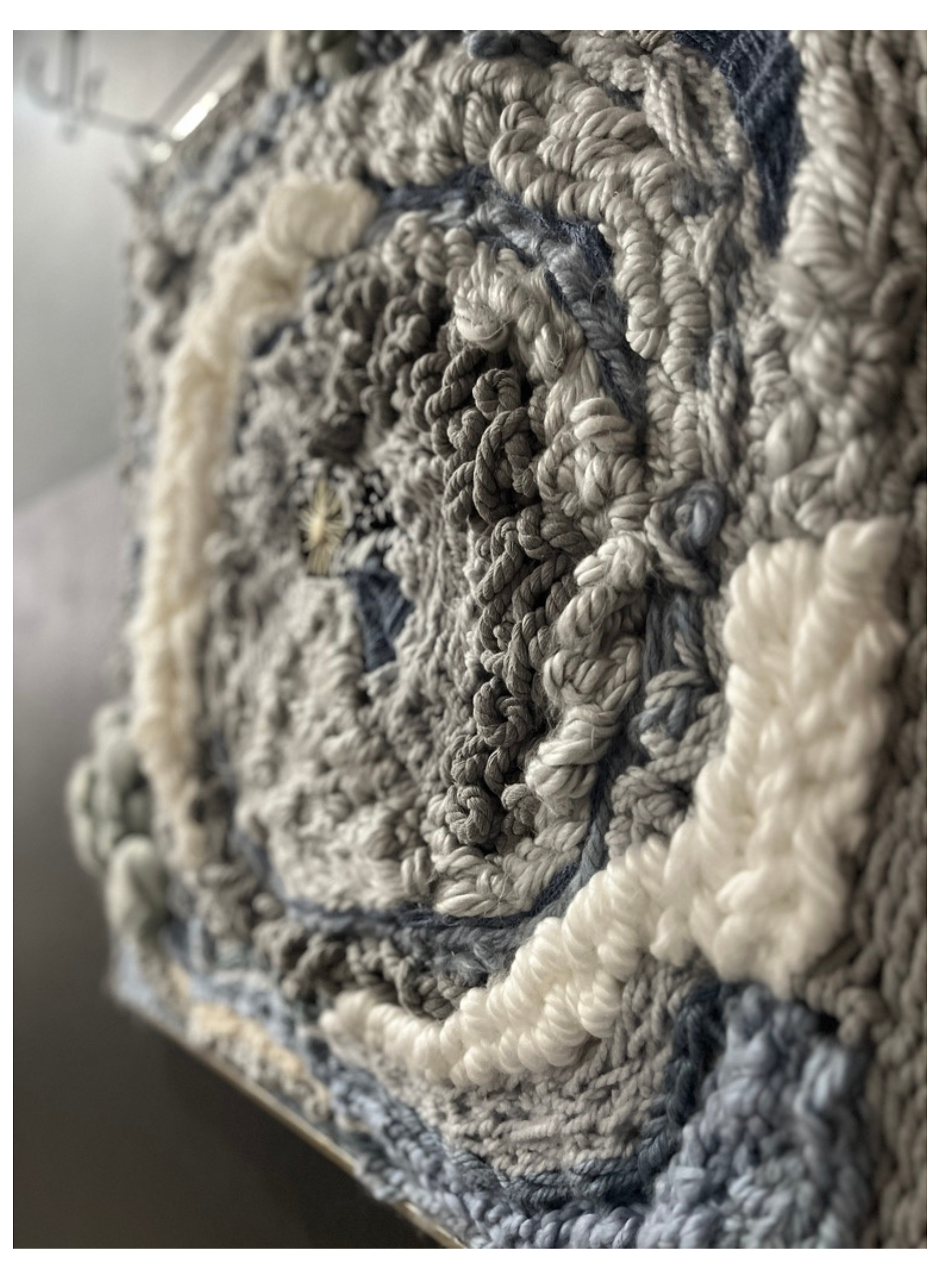 " This is my meditation between earth and memory. Its surface reads like a landscape - formed by time, marked by human gesture, pain, and resisting silence. A terrain of fiber and shadow, carrying both story and stillness. "